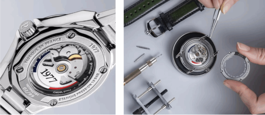 Les 150 pièces du mouvement sont réalisées à 100% dans l’arc jurassien entre la France (châssis, ponts de barillet, ancre, balancier, masse oscillante, platine, …) et la Suisse et son assemblage est réalisé à Maîche, dans sa manufacture historique.