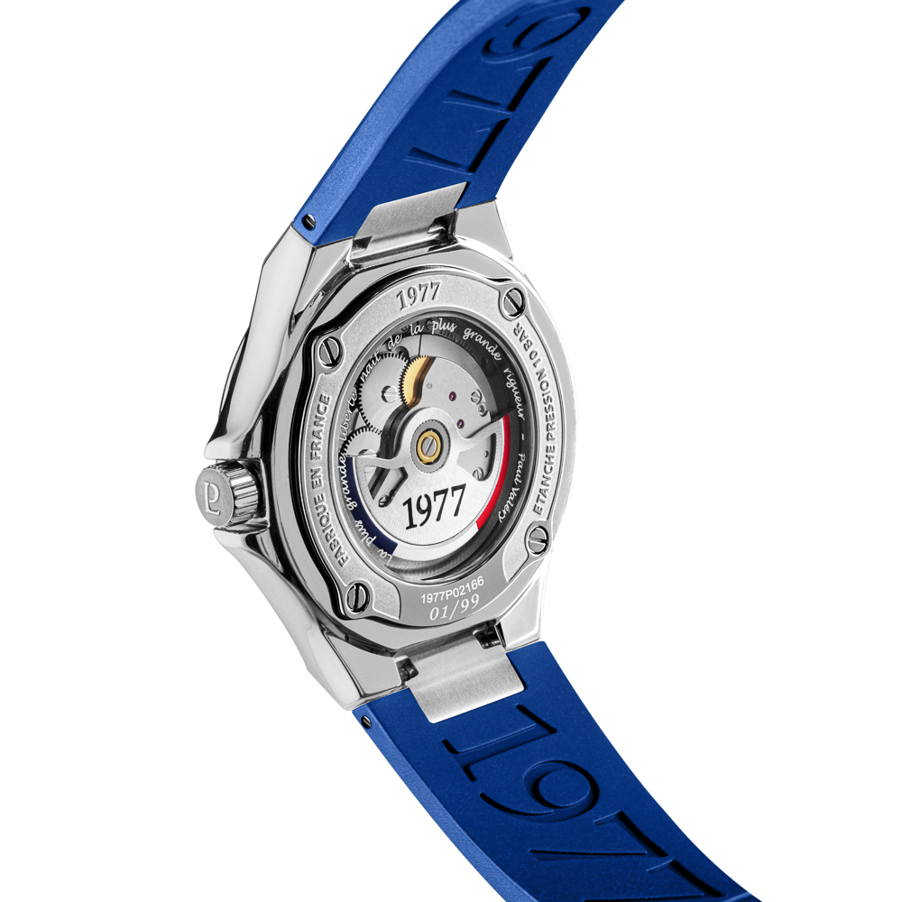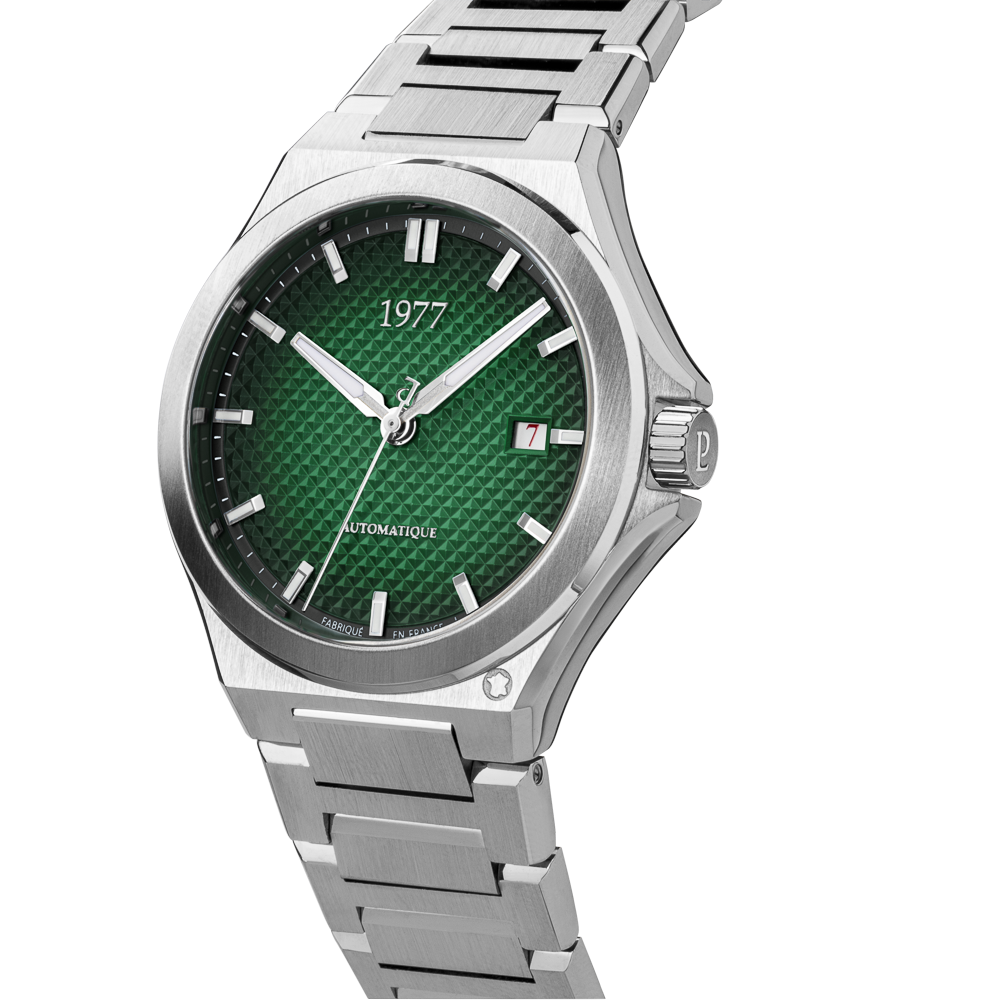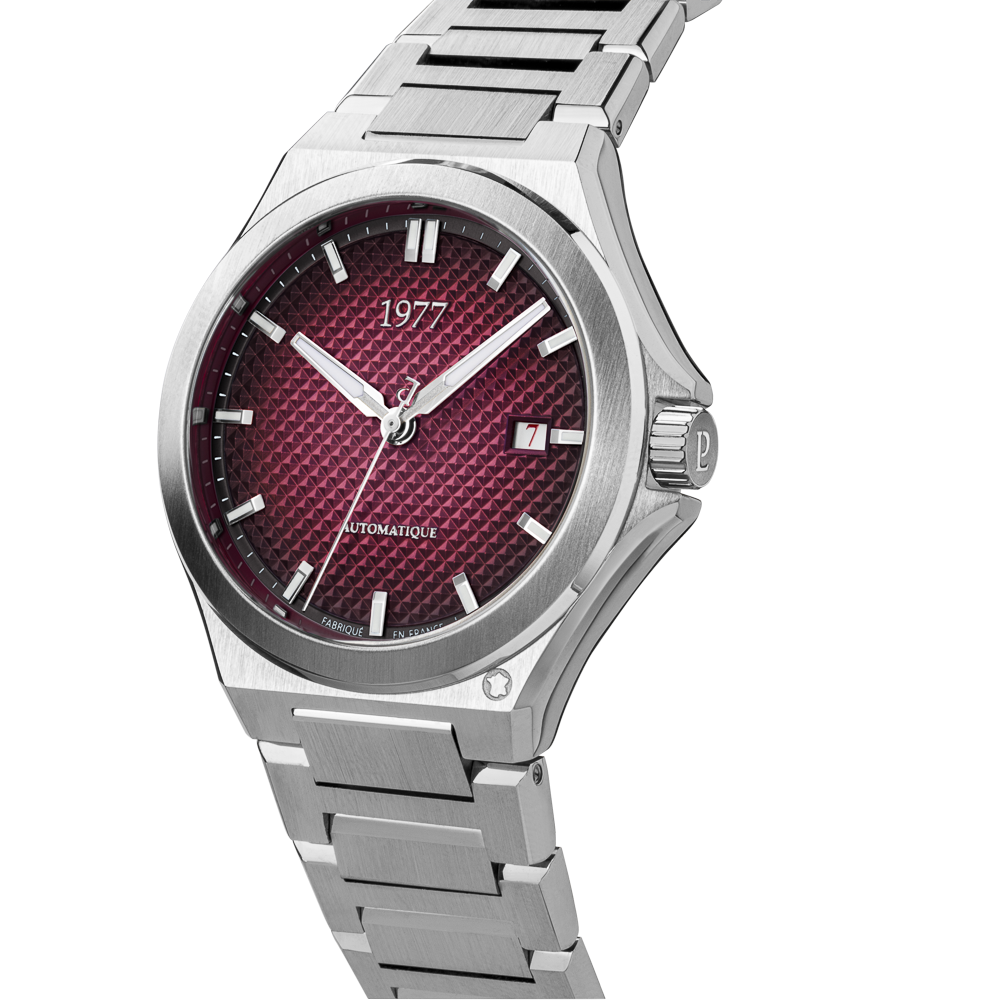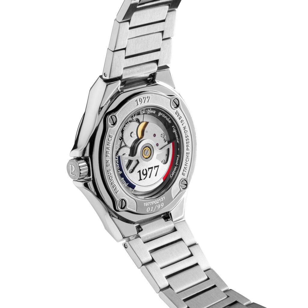 Le mouvement automatique France Ebauches utilisé dans toutes les montres 1977 est un mouvement issu des calibres historiques FE 4 600 et FE 5 600 produits jusqu’au début des années 1980. Ce mouvement robuste, fiable et performant a largement fait ses preuves avec plus de 25 millions d’exemplaires vendus durant ses 15 années de commercialisation.