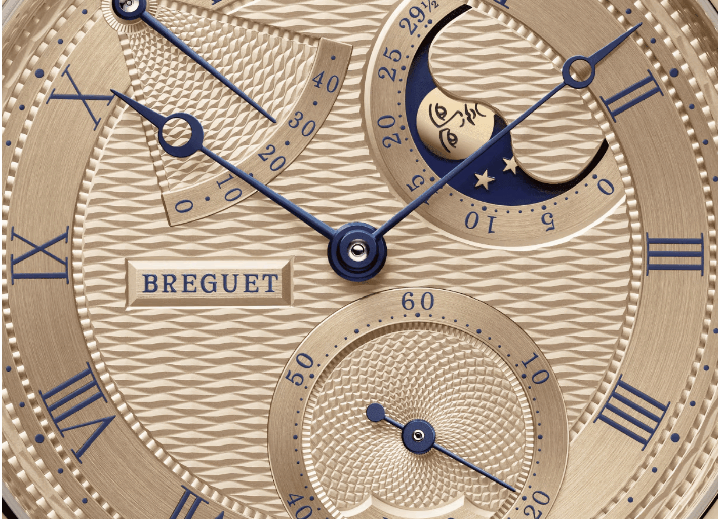 Pour ses 250 ans, la Manufacture Breguet dévoile progressivement des créations qui mettent un accent particulier sur la finition. La Classique 7235 ne fait pas exception. Elle est réalisée en or Breguet 18 carats. Le précieux alliage habille également le cadran. Ce dernier comporte le guilloché main du motif « Quai de l’Horloge », adresse historique d’A.-L. Breguet à Paris. Le secteur de la réserve de marche et de la petite seconde, de même que le pourtour du cadran présentent un même motif, mais circulaire. Ils permettent de les discerner avec une plus grande acuité. La Lune, à 2h, est la reproduction exacte de celle qui figure sur la montre N°5 de 1794. Elle est aussi réalisée en or Breguet.