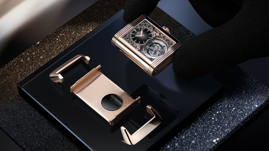 Sur le cadran avant, en référence subtile aux motifs géométriques Art déco qui ont déterminé le design original de la Reverso, les platines décoratives et les ponts présentent un treillis de fines lignes assorties à la couleur du boîtier en métal précieux. Ces lignes sont en fait des nervures ultrafines de la platine en or rose, qui sont apparues lorsque la surface a été creusée au laser pour créer les 200 cavités qui contiennent la laque. Les laques noires et grises ont été habilement appliquées à la main entre les nervures métalliques afin d’obtenir la richesse des couleurs et la profondeur souhaitées ; la surface est ensuite polie à la main pour obtenir un fini brillant parfaitement aligné avec les nervures.