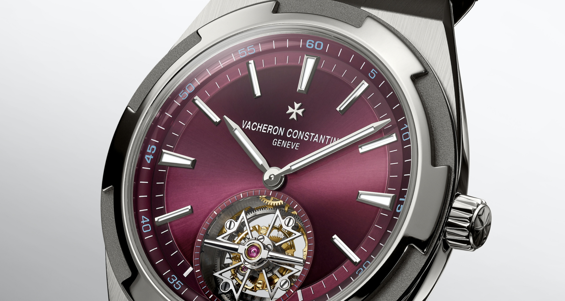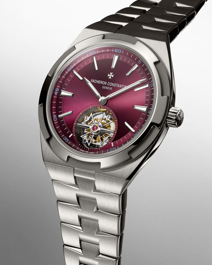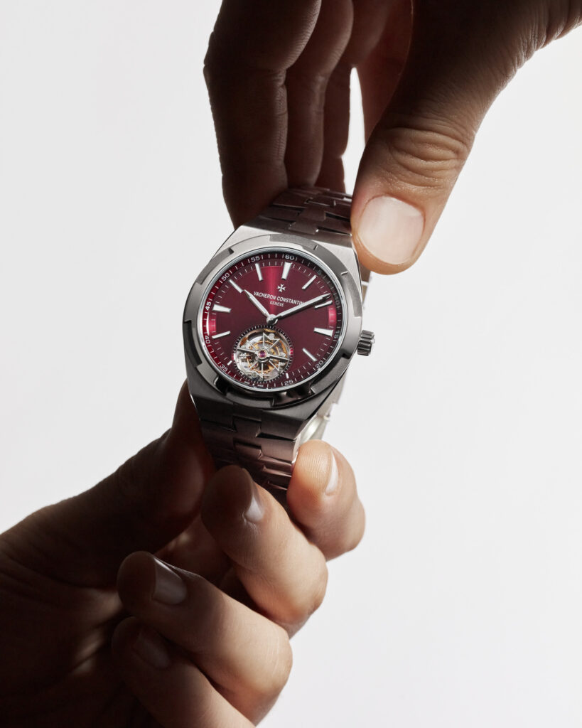 Un modèle Overseas à tourbillon en titane avec cadran de couleur rouge profond