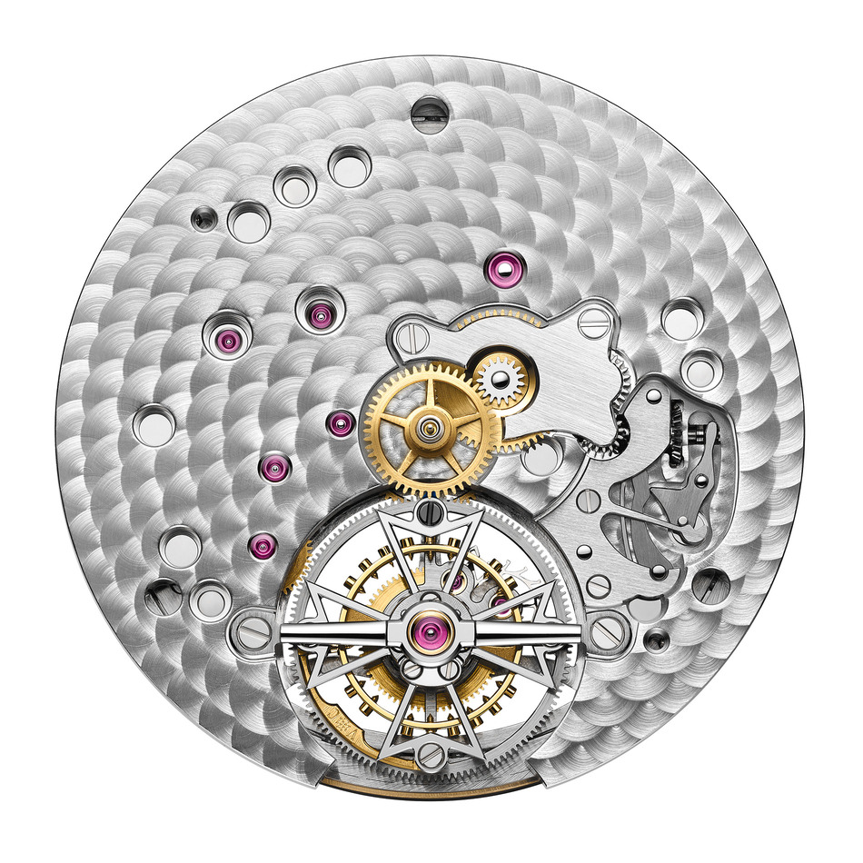 Conçues pour mettre en valeur la complexité de la pièce, les finitions du mouvement offrent de subtils jeux de lumière sur ses 188 composants, soulignant avec élégance sa sophistication. Le calibre présente une platine perlée, les ponts sont décorés Côtes de Genève et anglés à la main, la barrette du tourbillon est délicatement bercée, les roues grenées et les vis chanfreinées et polies : autant de détails qui témoignent d’un artisanat minutieux.